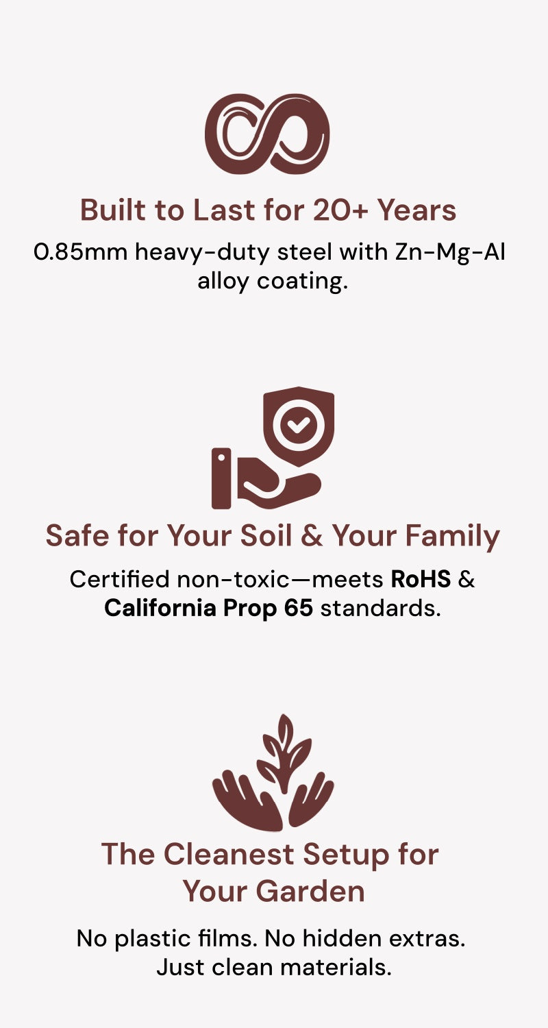 With 0.85mm heavy-gauge galvanized steel panels and a self-healing Zn-Al-Mg coating, Annoell raised garden beds are built to be durable and long-lasting—engineered for 20+ years of warp-free, corrosion-resistant performance.